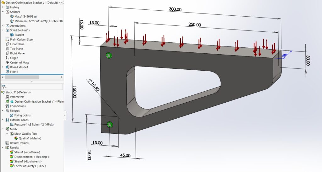 Starting a Static Simulation Study: Proceed to set up a new static simulation study. Here, we’ll be configuring the simulation environment, starting with selecting ‘plain carbon steel’ for the bracket material. This material is chosen for its widespread availability and balanced properties, such as strength and ductility, making it a standard choice in engineering applications.