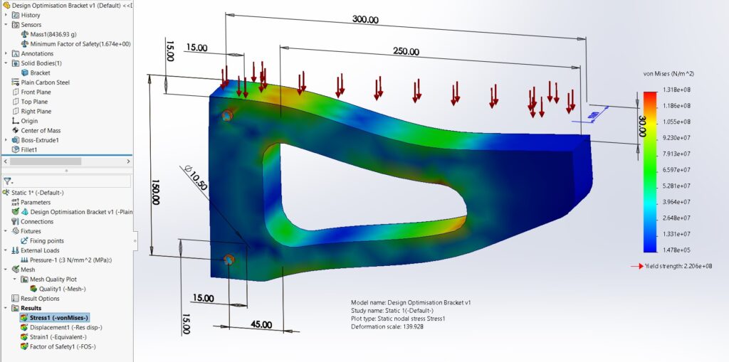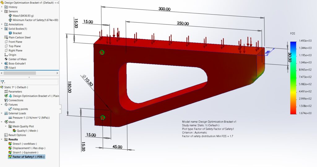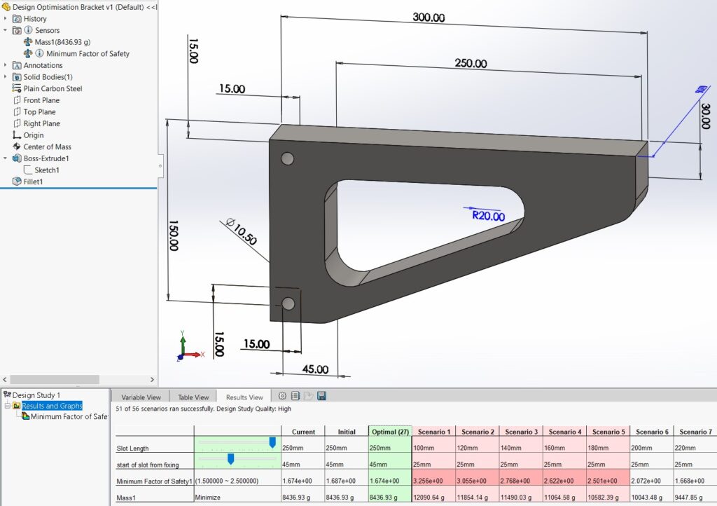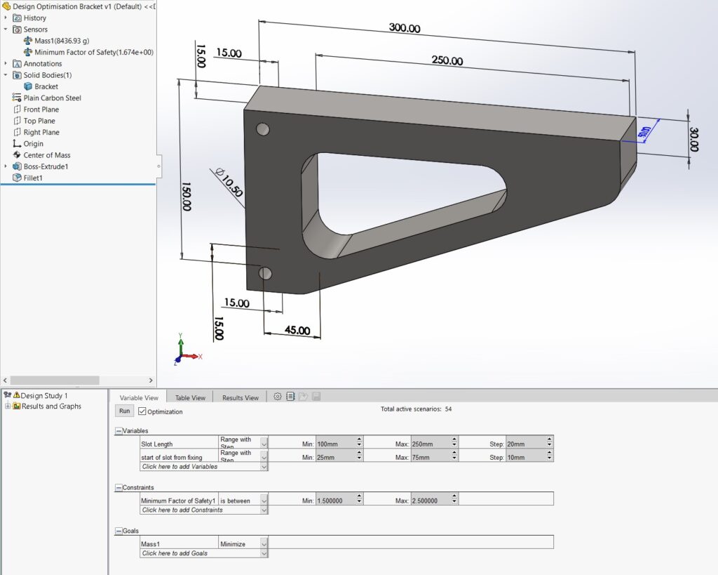 Conducting a New Design Study: a) Designate the slot length as a variable parameter, with values ranging from a minimum of 100mm to a maximum of 250mm, and incrementing by 20mm. This variable adjustment allows for exploring the impact of slot length on the design’s performance, facilitating an informed decision-making process for optimising the design. b) Set a constraint on the Factor of Safety, ensuring it remains within the 1.5 to 2.5 range. This constraint is crucial for guaranteeing the design maintains its structural integrity and safety under all tested conditions. c) Target the minimisation of mass as the primary goal, with the optimisation option selected, and initiate the study. This goal is aimed at achieving the most efficient design possible in terms of material usage, which is beneficial for cost reduction, environmental considerations, and compliance with project specifications or regulatory requirements.